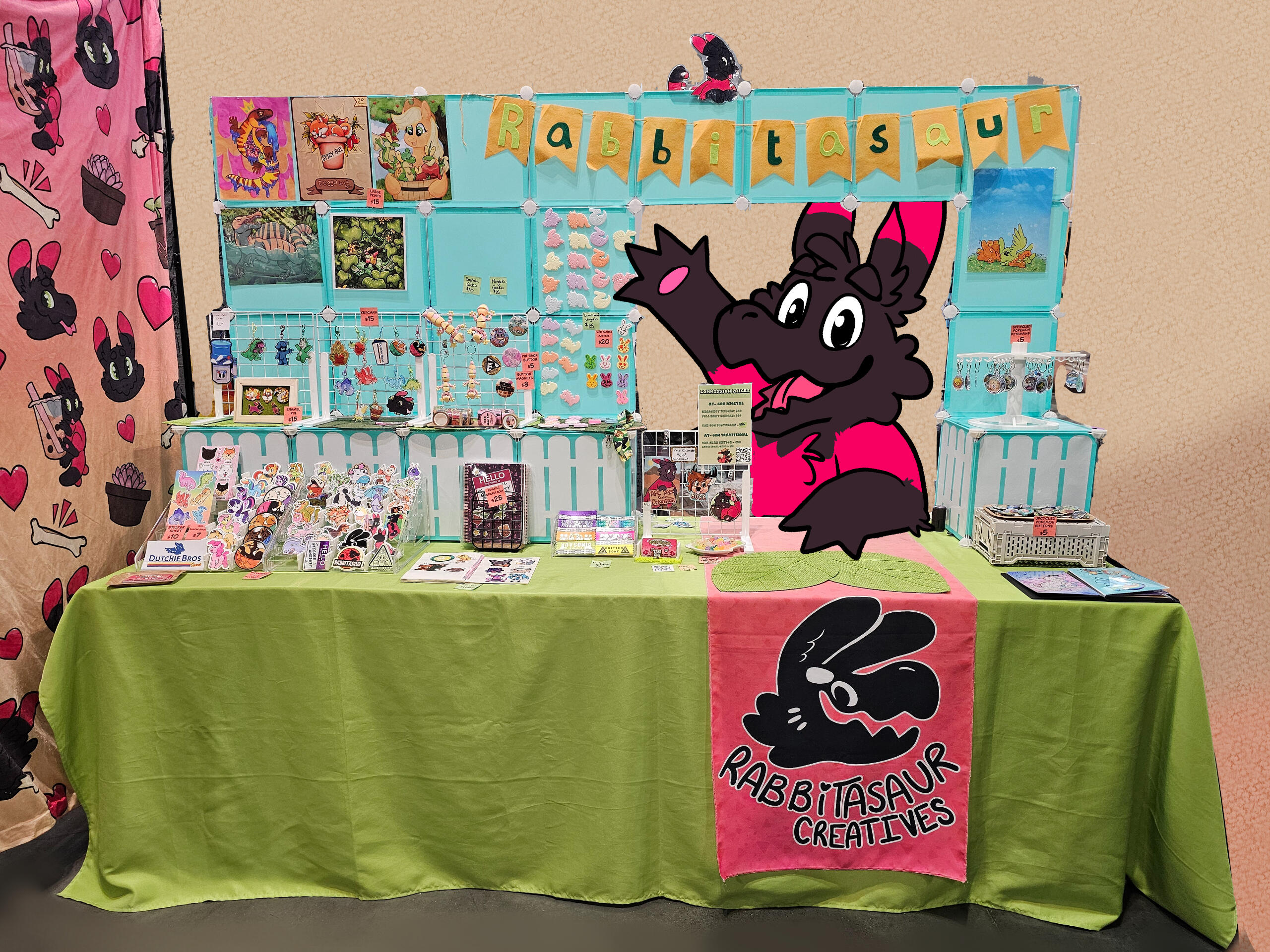 Rabbitasaur Creatives is my Southern California-based small business, and I’ve been bringing my cute and colorful critters to the convention scene since 2016! From dinosaurs and dogs to reptiles and plants, my work is known for its cartoony, bright, and unique style. I enjoy creating original characters and offering fans a diverse range of merchandise to enjoy. At my booth, you’ll find handcrafted art and merchandise—such as pins, prints, stickers, and more—focused primarily on original designs, with a small selection of fan art. At conventions, I also offer digital commissions at-con, usually creating 6–10 unique pieces per event.